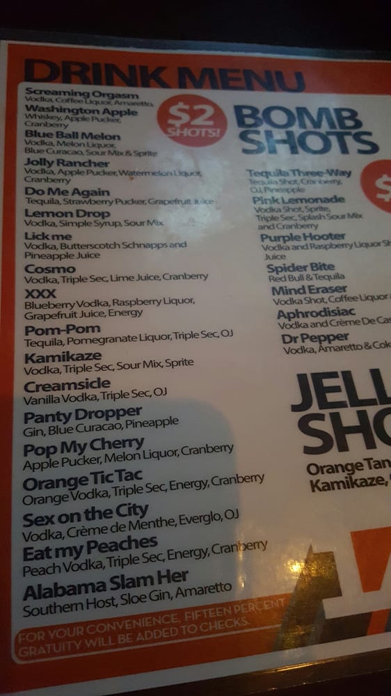 Kamikaze, lemon drop, Do me again, jolly rancher, Strawberry Daiquiri, screaming orgasm, washington apple, sex on the city, cosmo, Appleton, Mai Tai, Mudslide, Long Island Ice Tea, Pina Colada